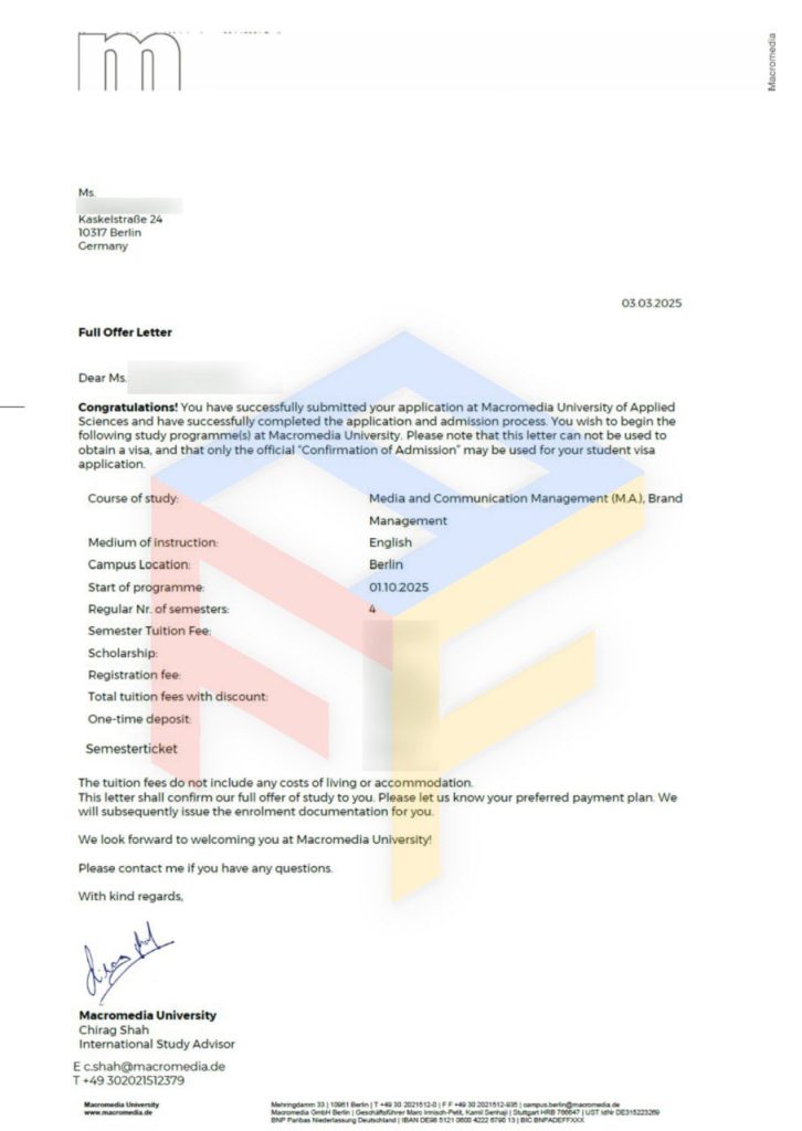 - دانشگاه پذیرش شده: دانشگاه ماکرومدیا آلمان