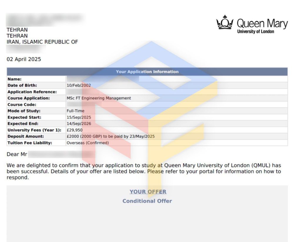- دانشگاه پذیرش شده: دانشگاه کوئین مری