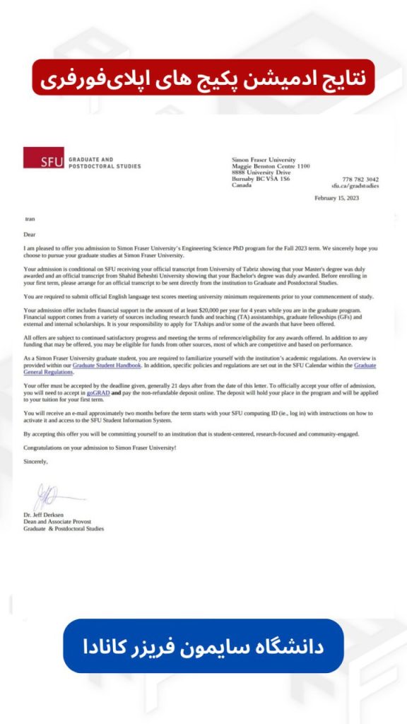 - مقطع و دانشگاه پذیرش شده: مقطع دکتری دانشگاه سایمون فریزر کانادا