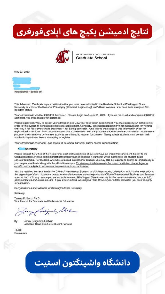 - دانشگاه پذیرش شده: واشینگتون استیت آمریکا