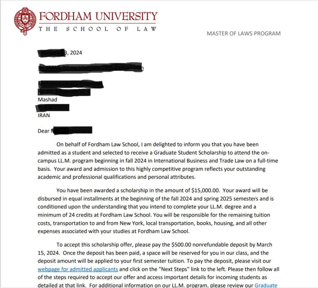 - دانشگاه پذیرش شده: فوردهام آمریکا