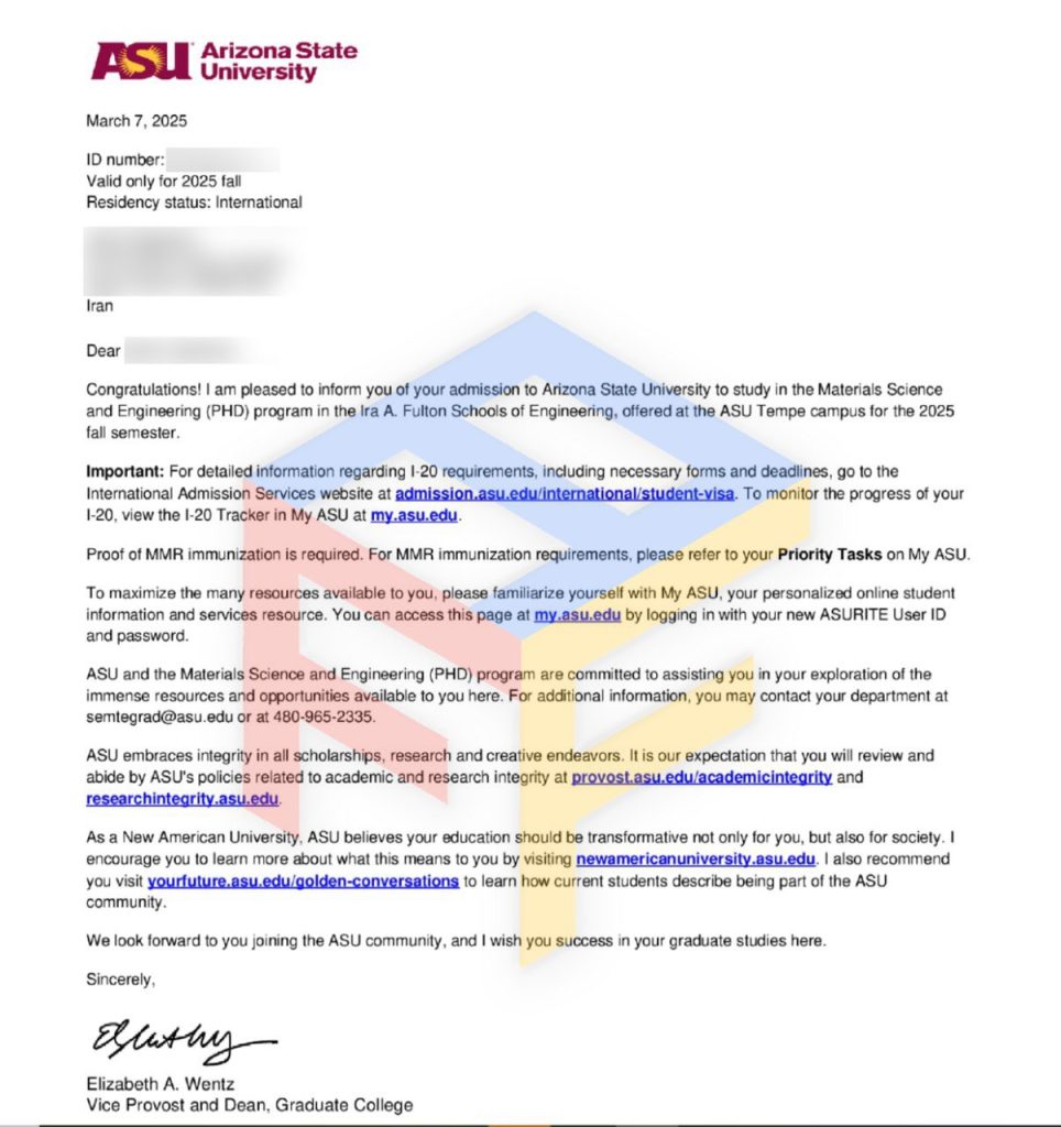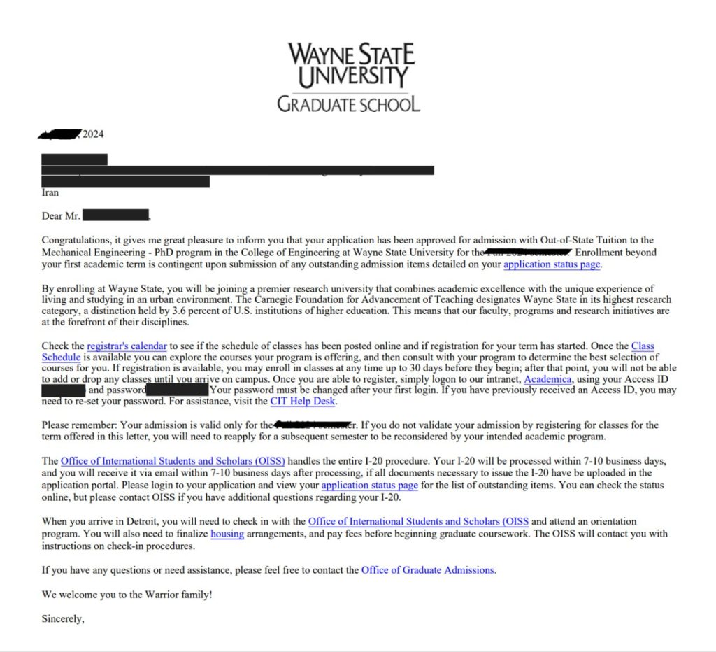 - دانشگاه پذیرش شده: دانشگاه ایالتی وین آمریکا