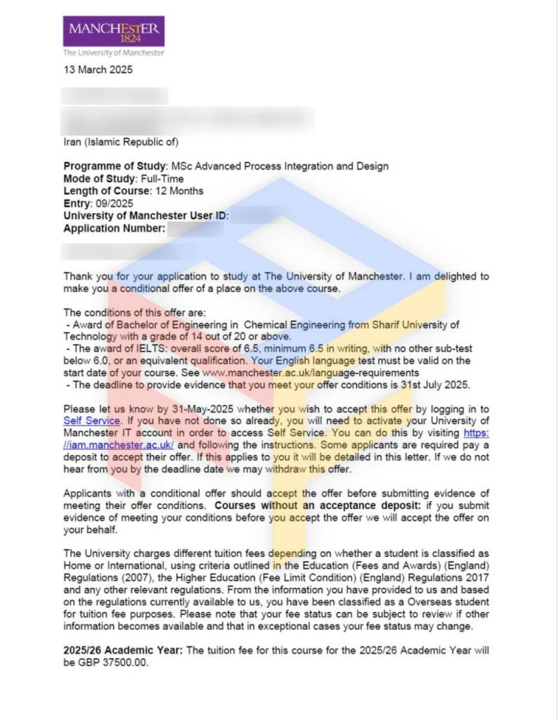- دانشگاه پذیرش شده: دانشگاه منچستر