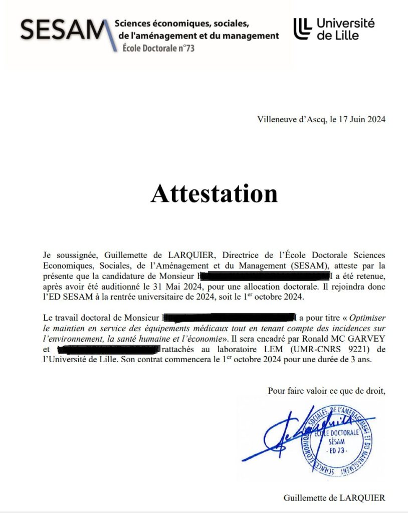- دانشگاه پذیرش شده: دانشگاه لیل فرانسه