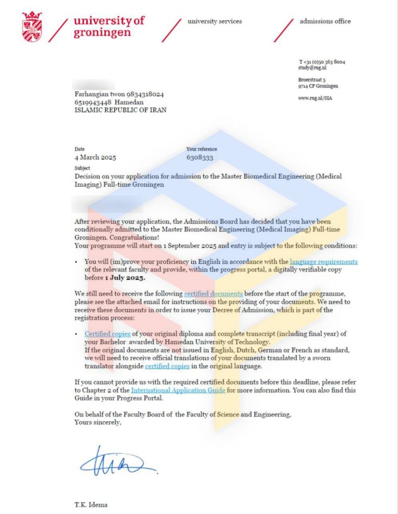 - دانشگاه پذیرش شده: دانشگاه خرونینگن هلند
