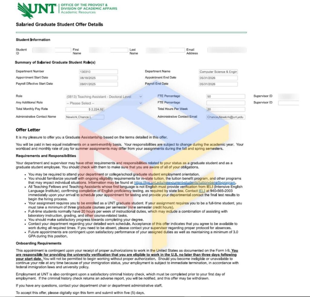 - دانشگاه پذیرش شده: دانشگاه شمال تگزاس (UNT)