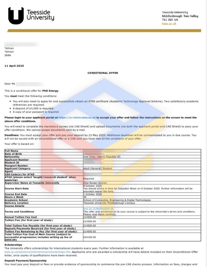 - دانشگاه پذیرش شده: Teesside University, Middlesbrough